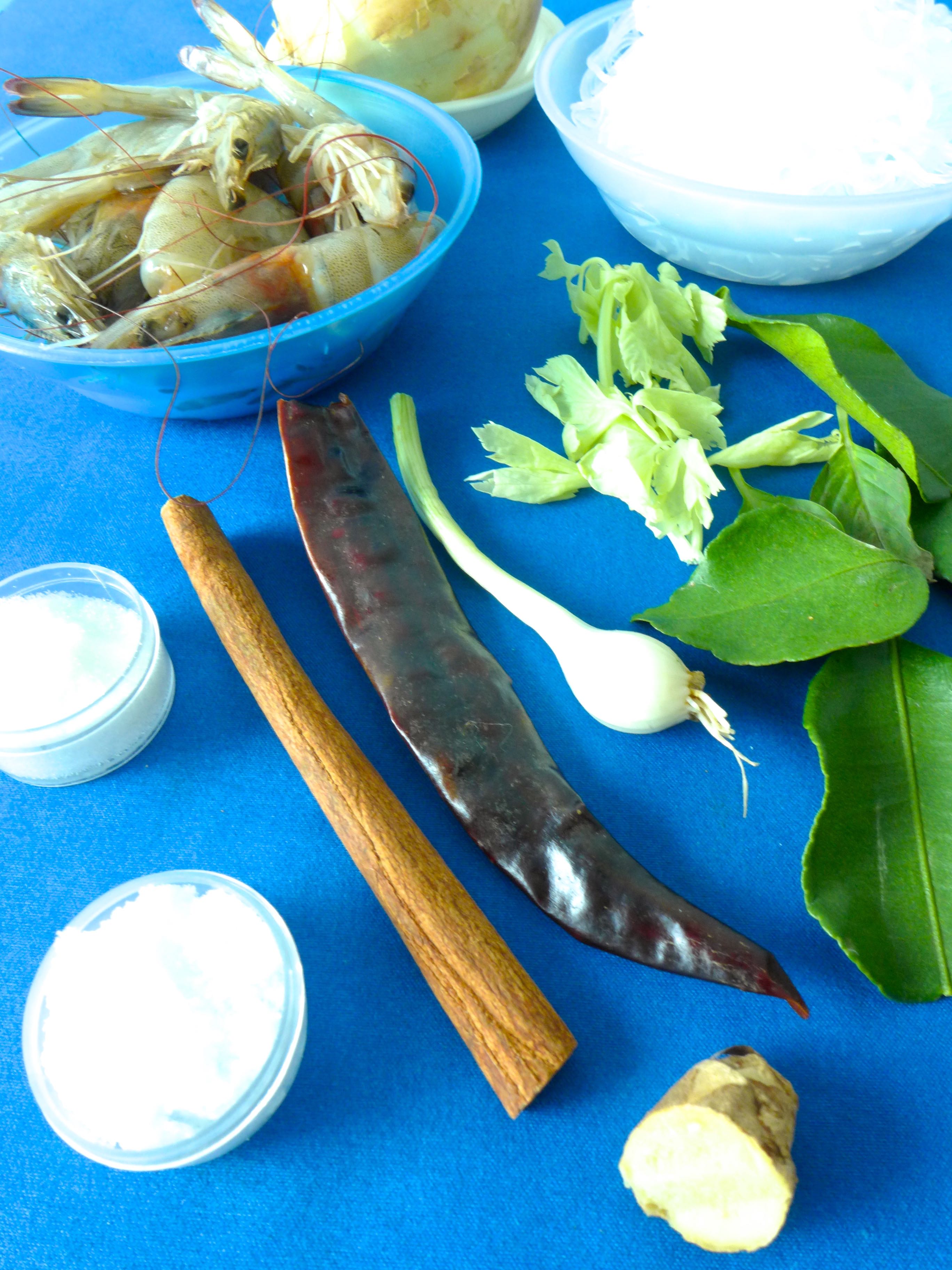 Pelo las gambas y cuezo las cáscaras en un litro de agua. Lo cuelo, vierto el caldo a la cazuela y añado otro litro de agua. Echo la canela, las cebolletas, el jengibre, dos hojas de lima, dos hojas de albahaca, el azúcar y la sal. Lo dejo cocer a fuego lento durante 30 minutos.
