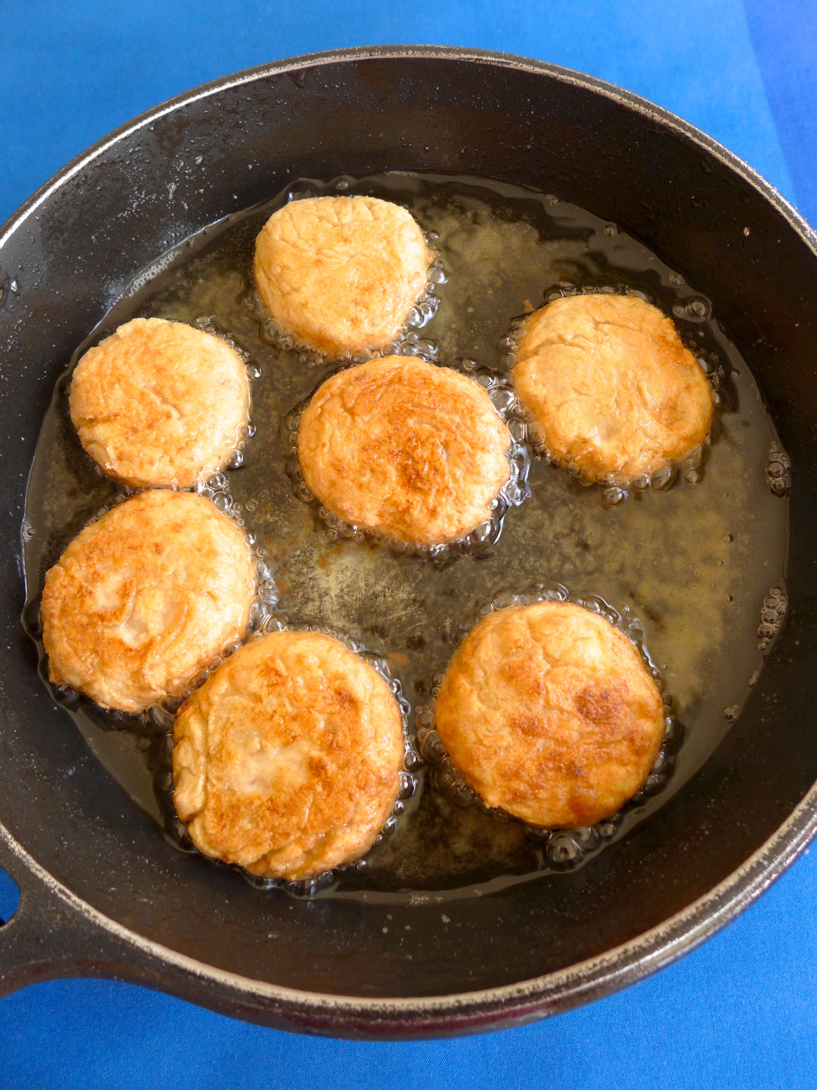 Formo las albóndigas y las frío en una sartén con aceite a fuego medio para que se hagan bien por dentro y se doren por fuera. Las retiro y las mantengo en una cazuela al calor, tapadas.