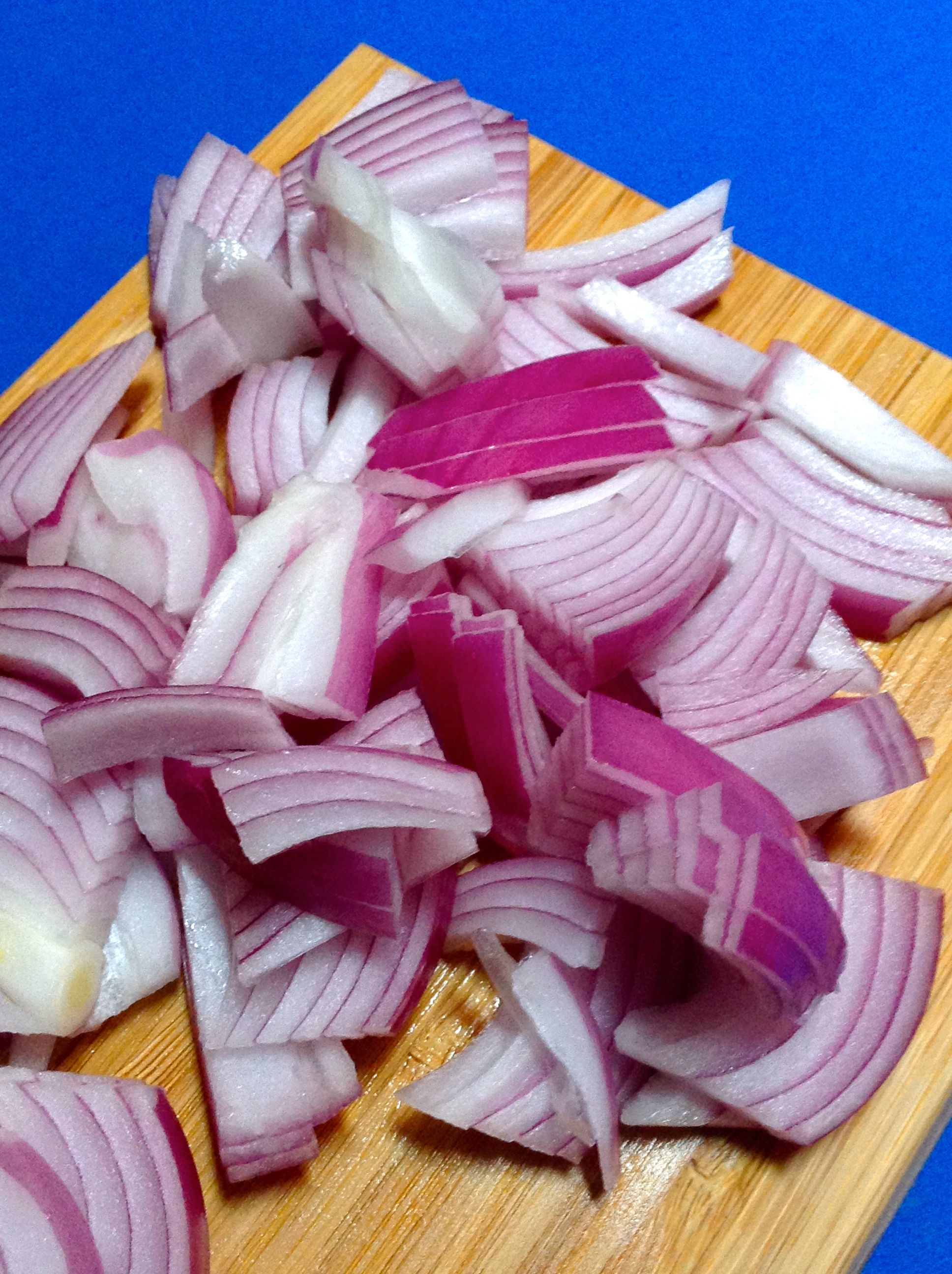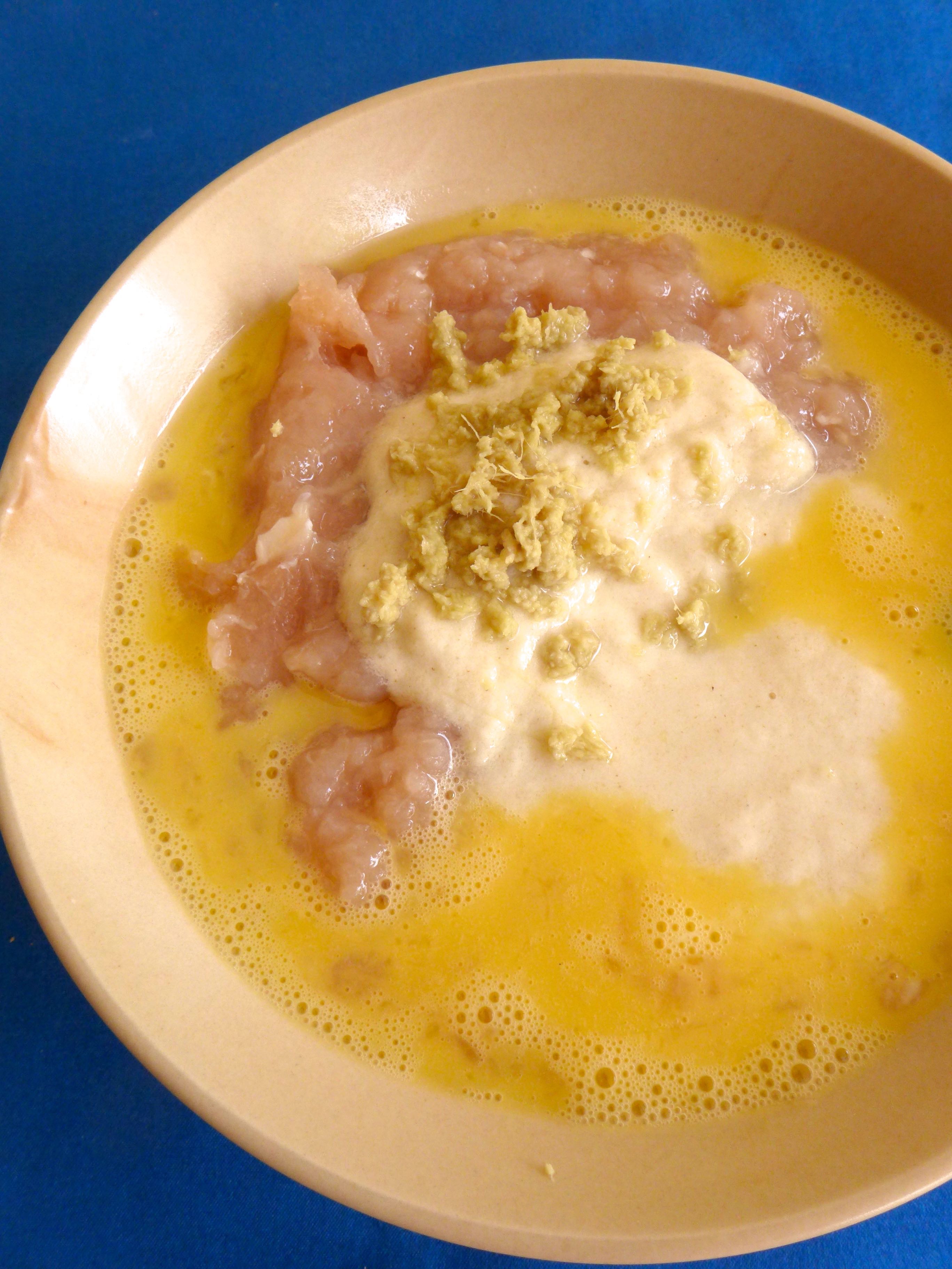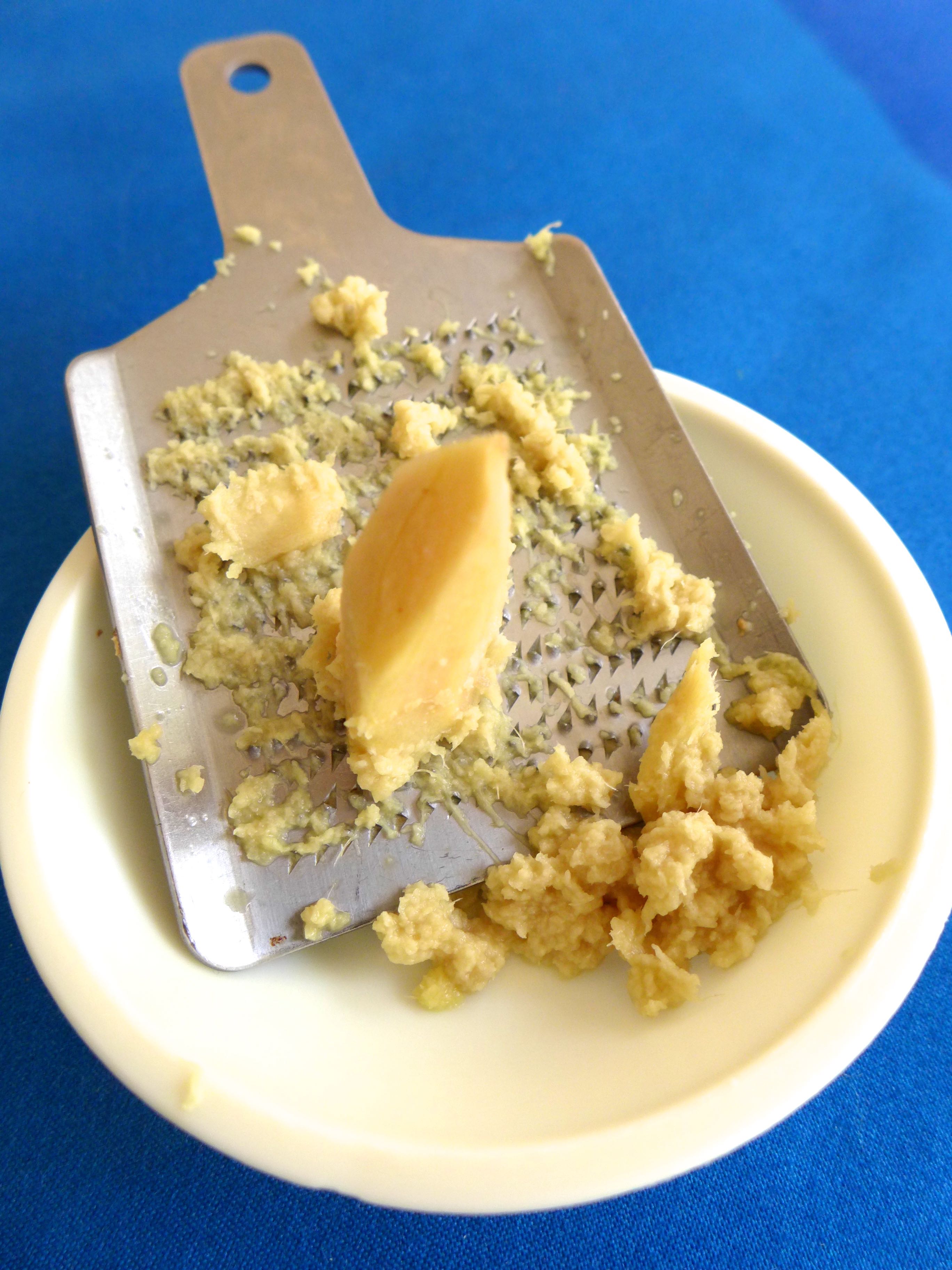 Bato el huevo. Pico la jicama, la cebolla, el apio y la cebolleta. Rallo el jengibre.