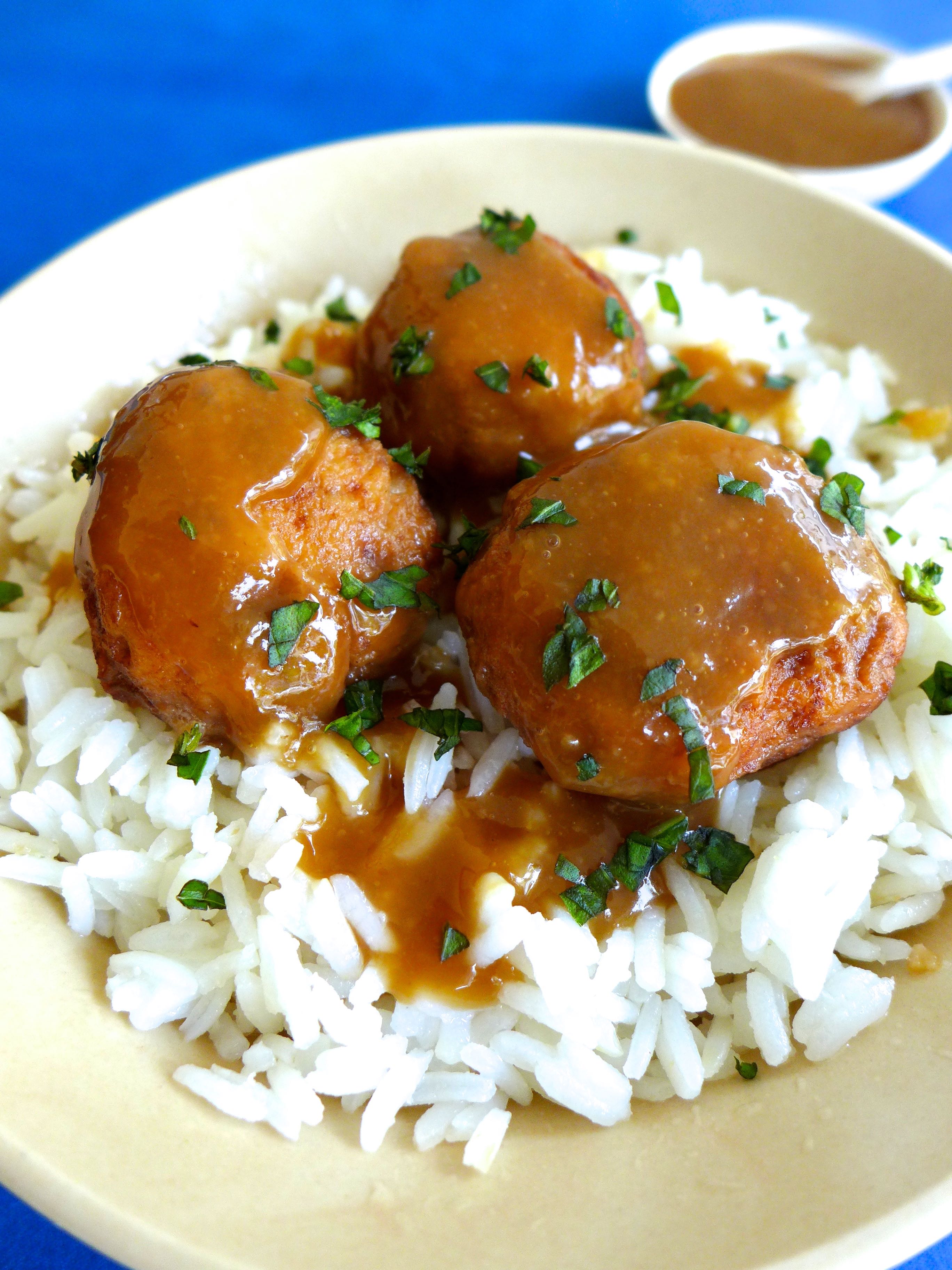 Sirvo la salsa sobre las albóndigas y las sirvo con arroz