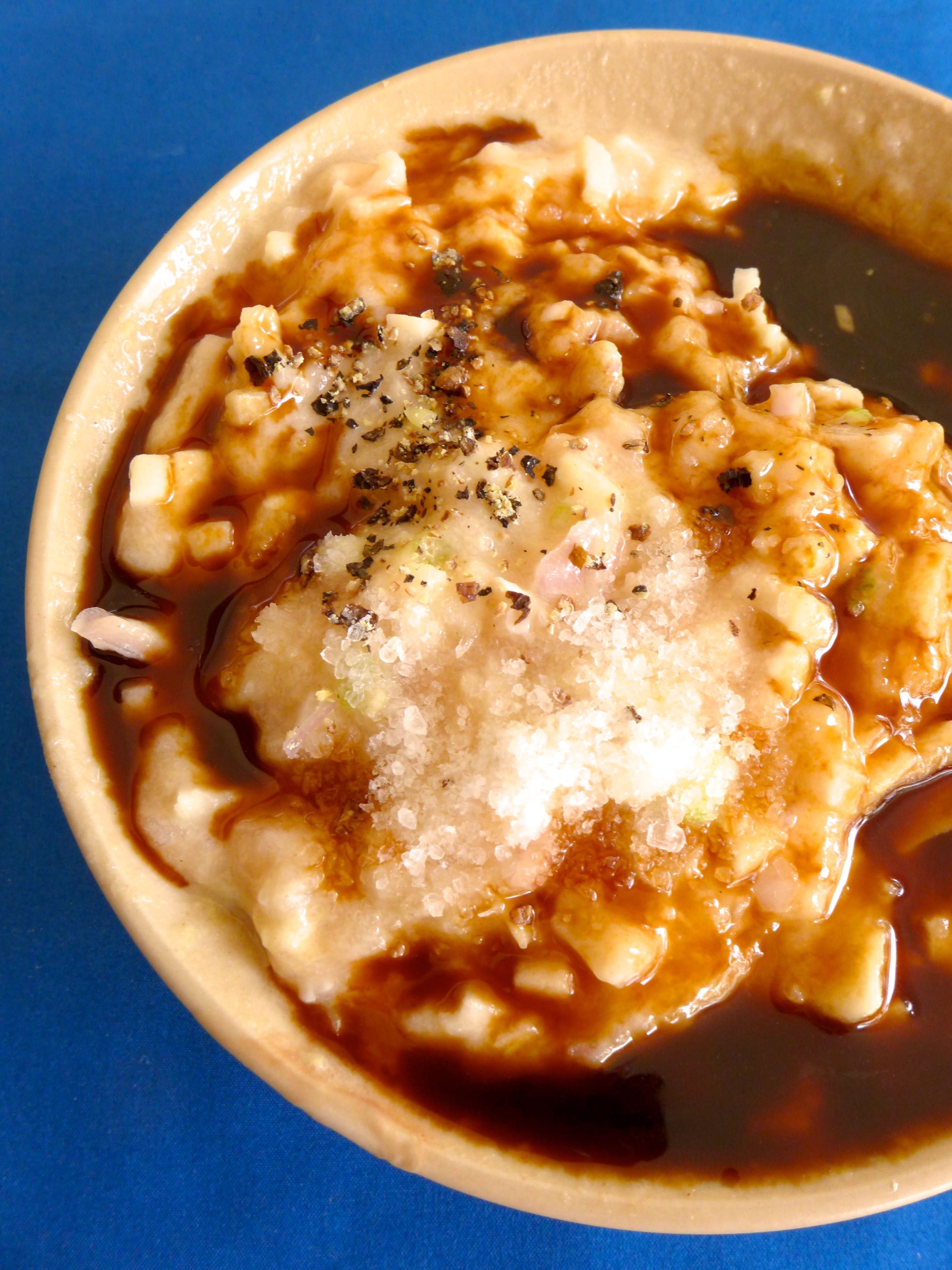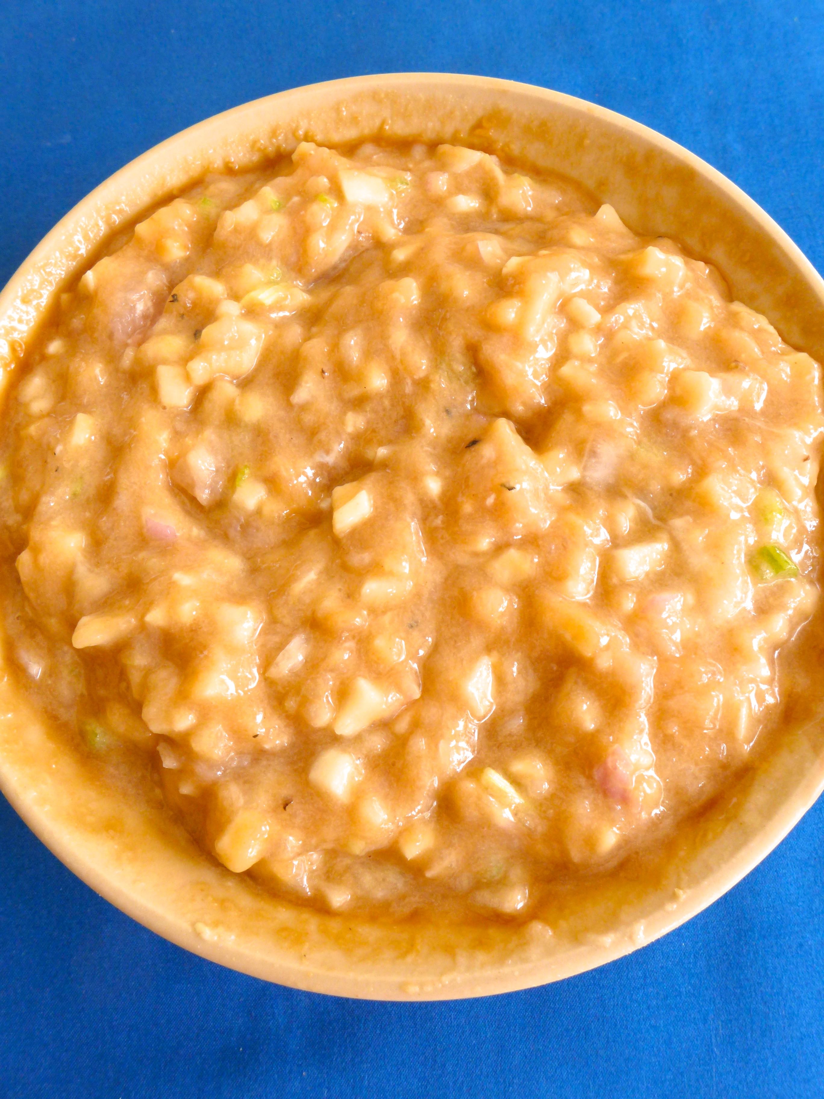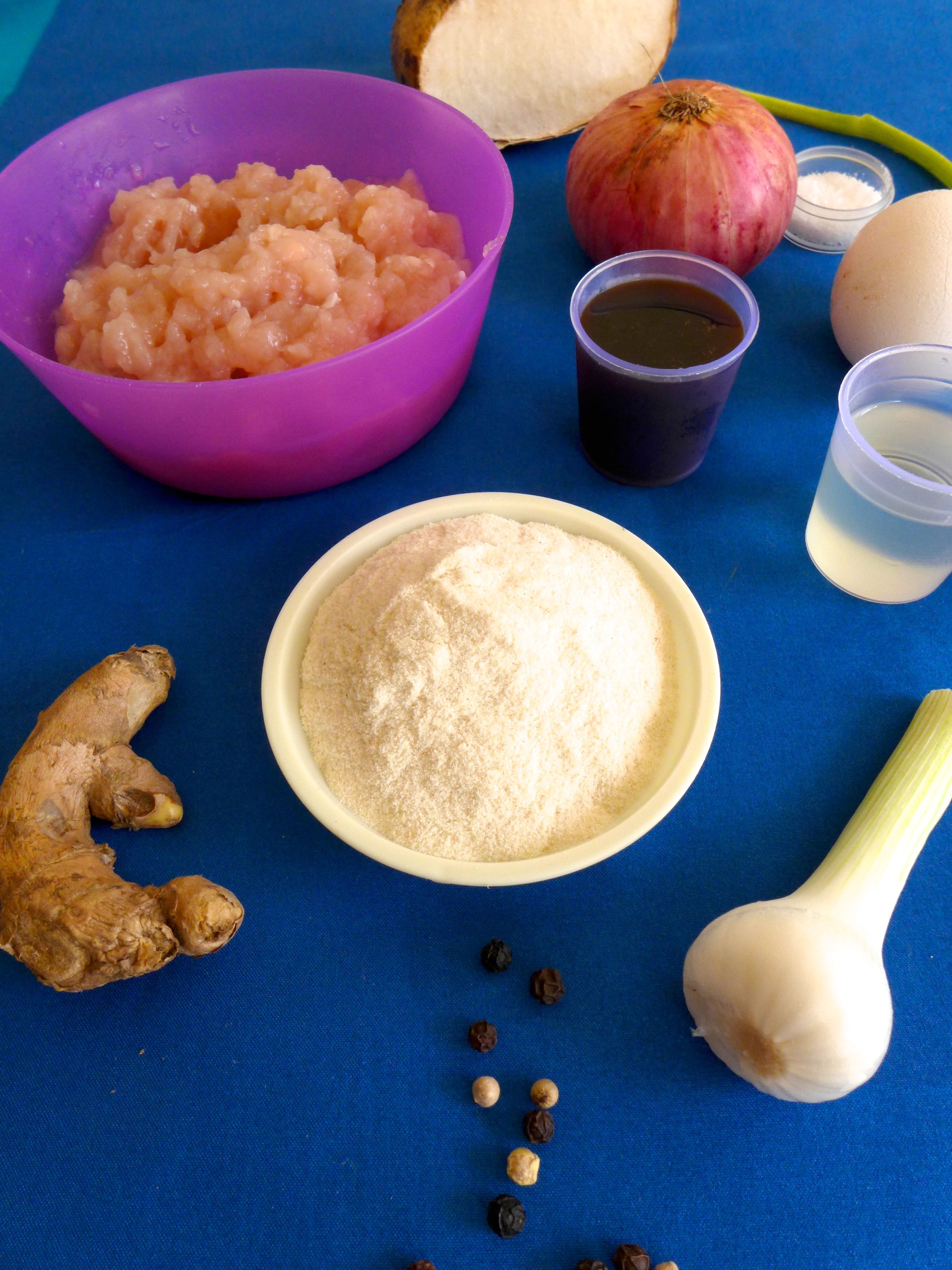 Mezclo la harina y el agua, y lo junto con la carne, el huevo, el jengibre, la jicama, la cebolla, el apio, la cebolleta, la salsa de ostras, la pimienta y la sal.