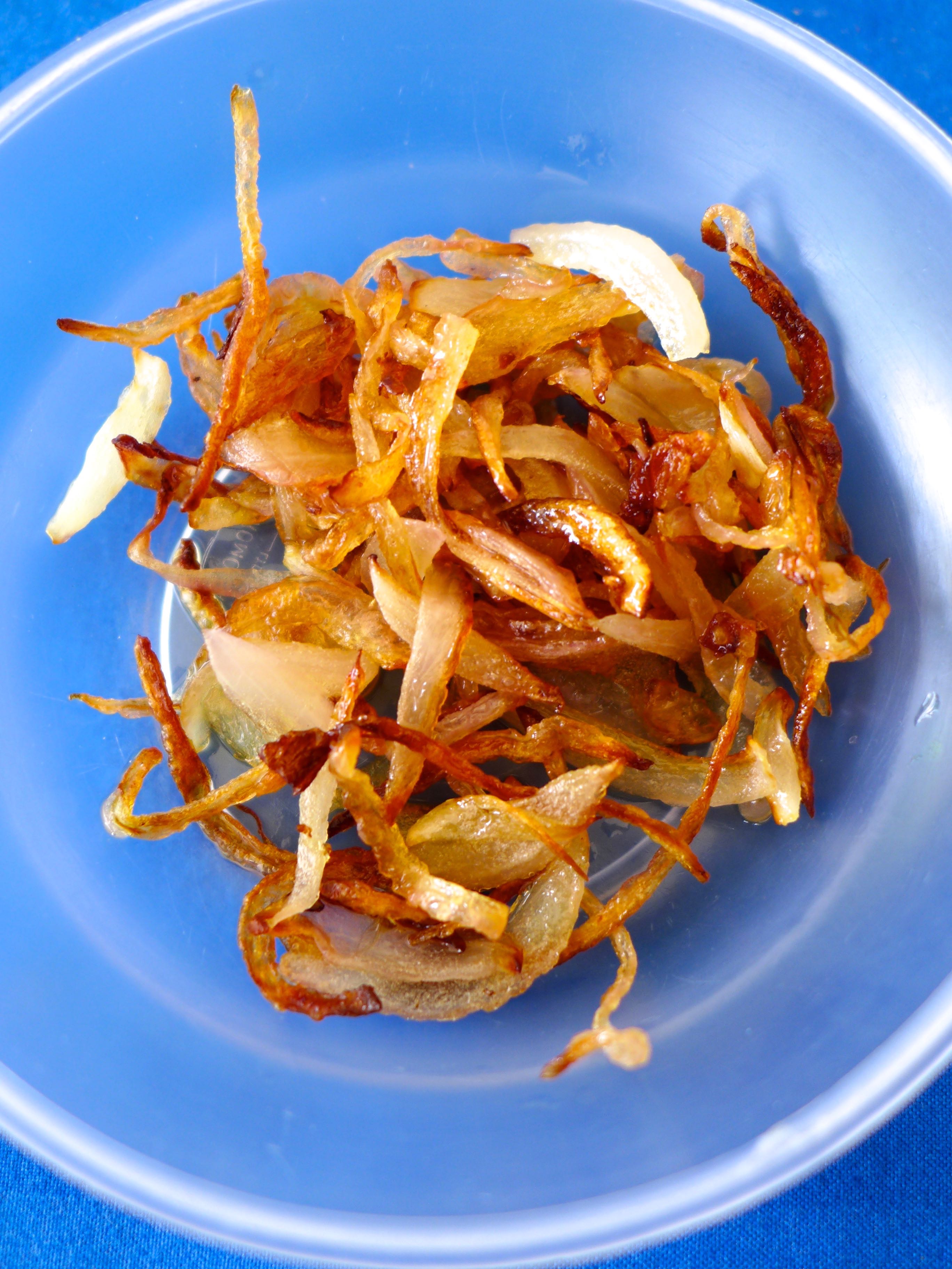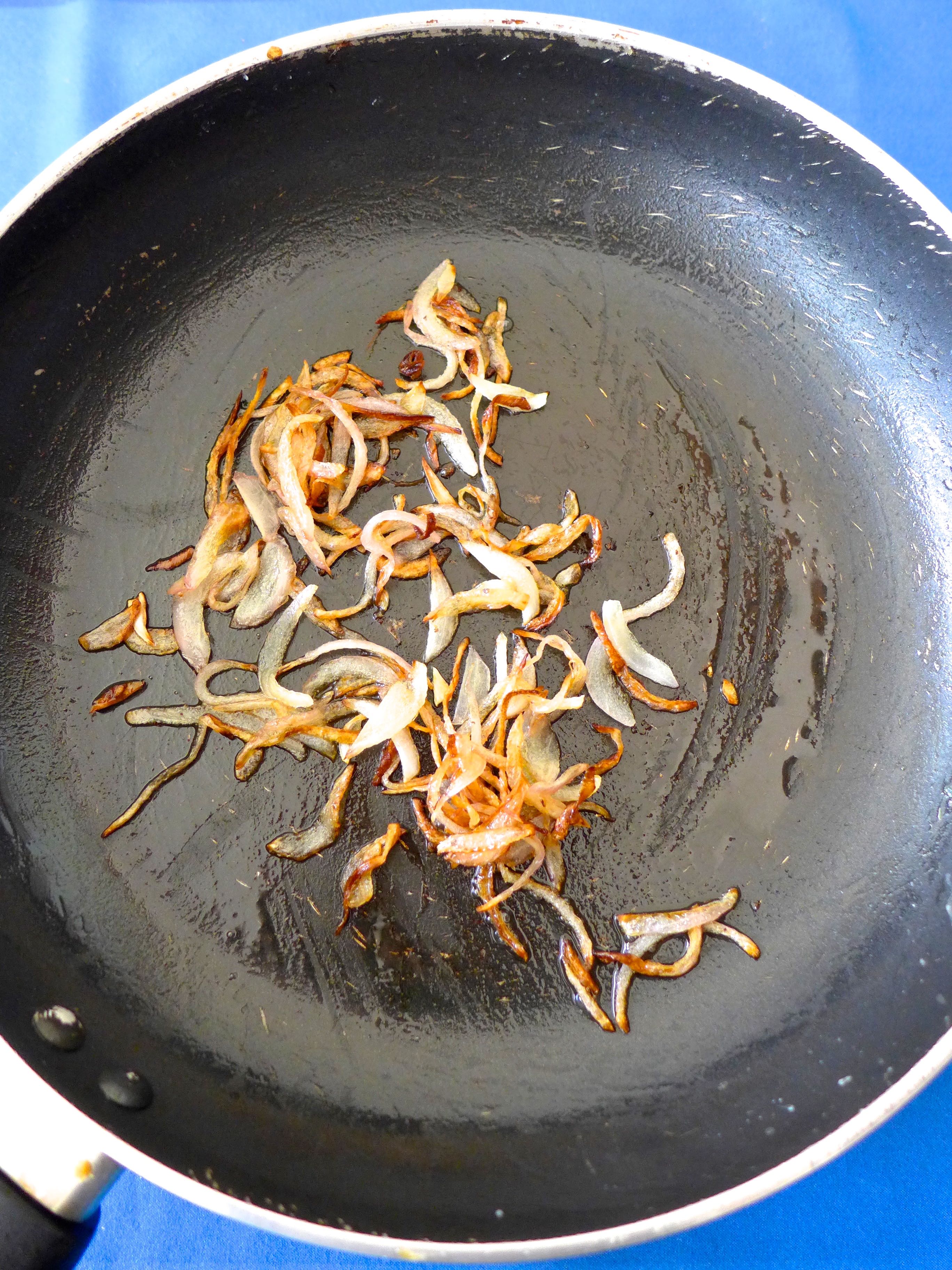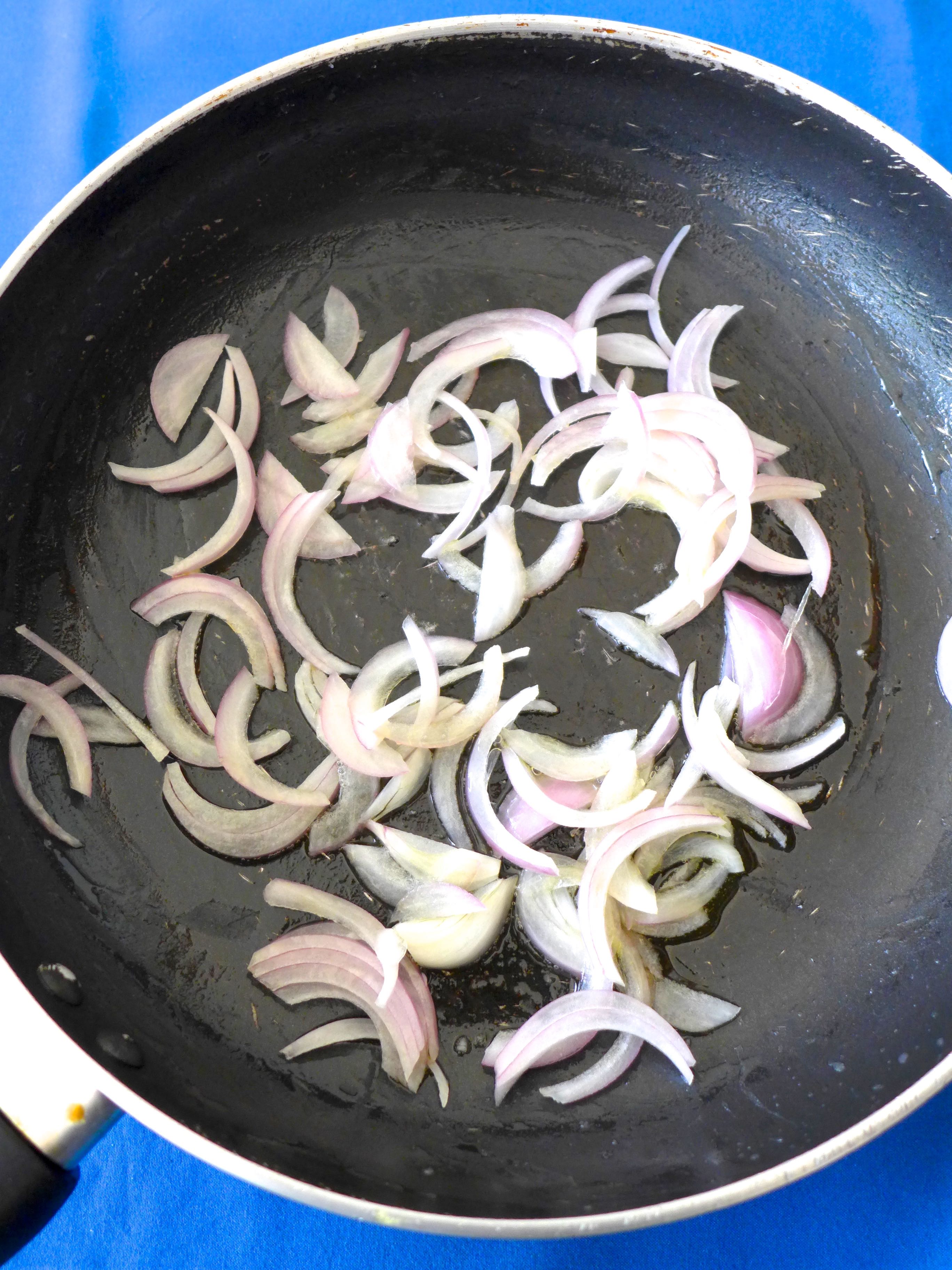 Corto la cebolla en juliana y la doro en una sartén con un poco de la mantequilla ghee a fuego medio-alto.