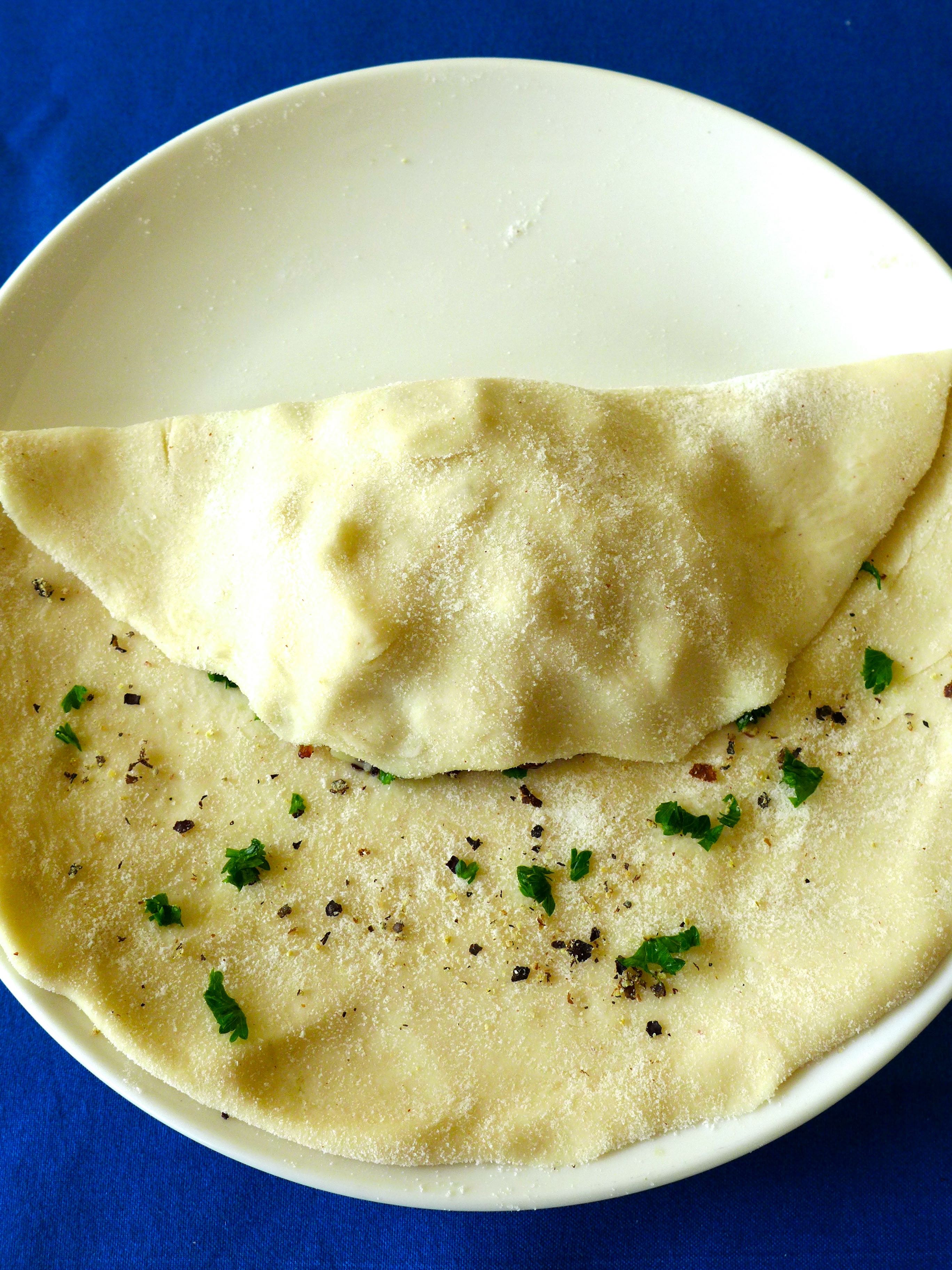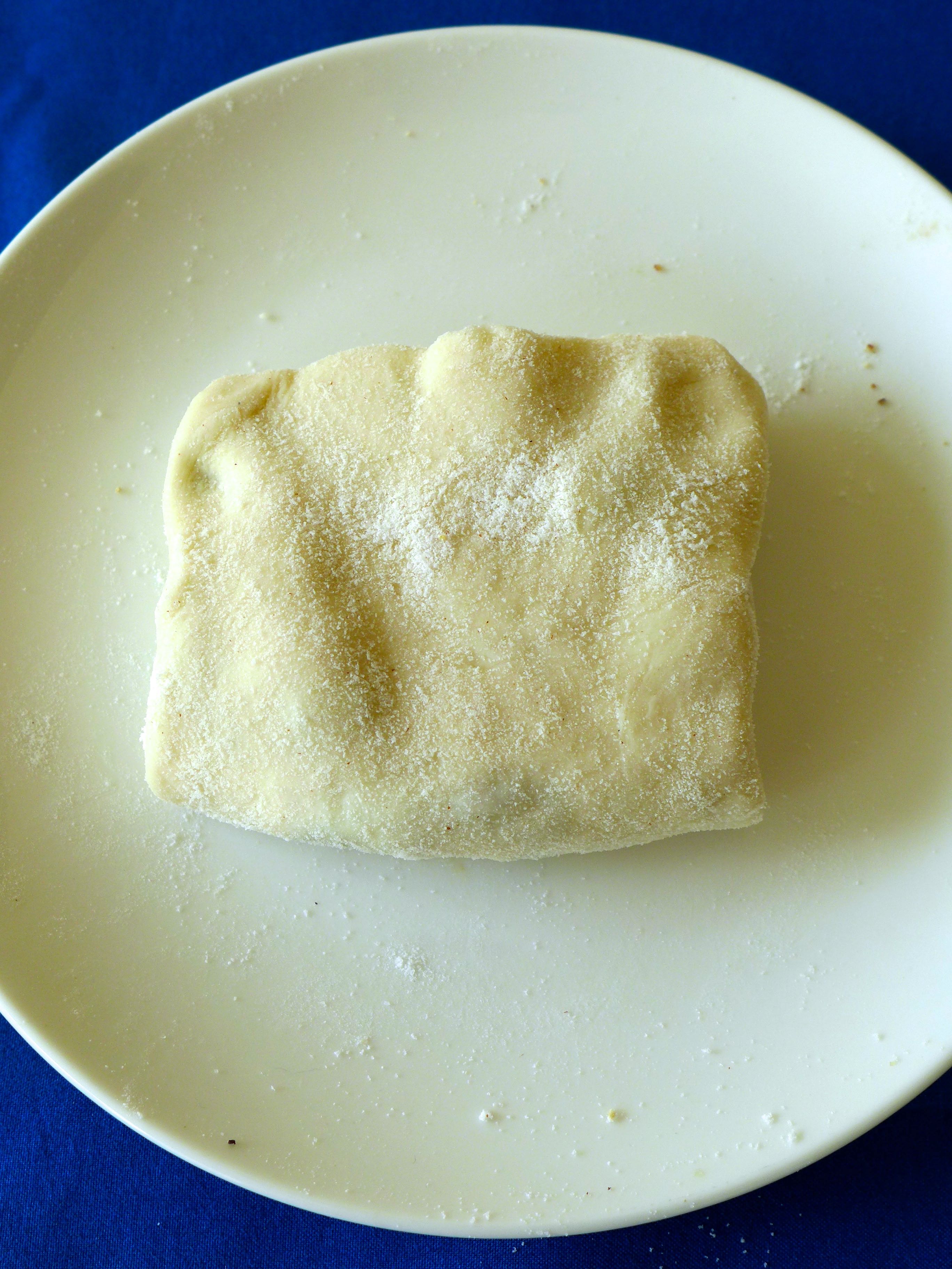 Envuelvo estos ingredientes doblando los cuatro lados hacia el centro. Lo aplasto y lo dejo reposar, tapado con un paño, 10 minutos.